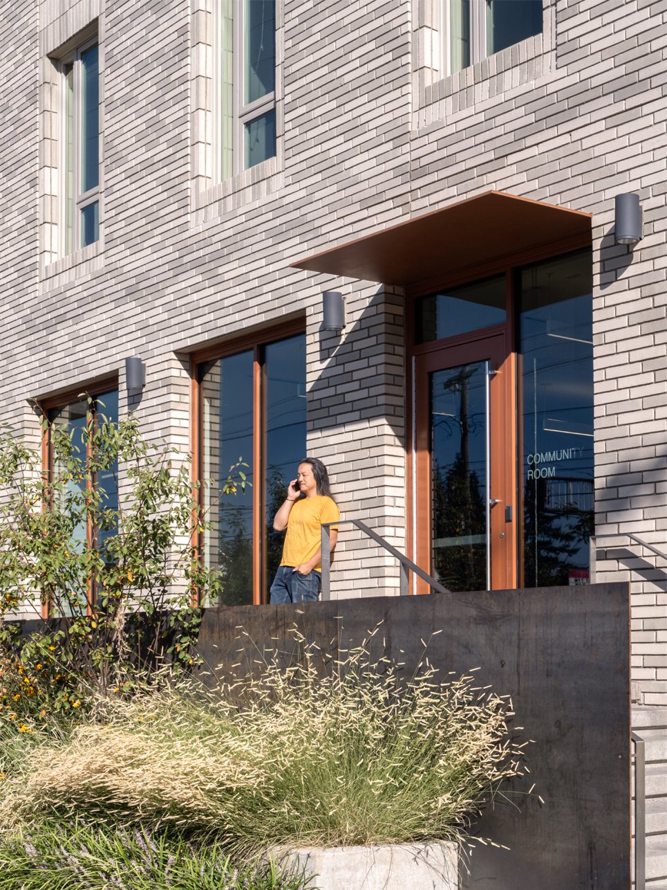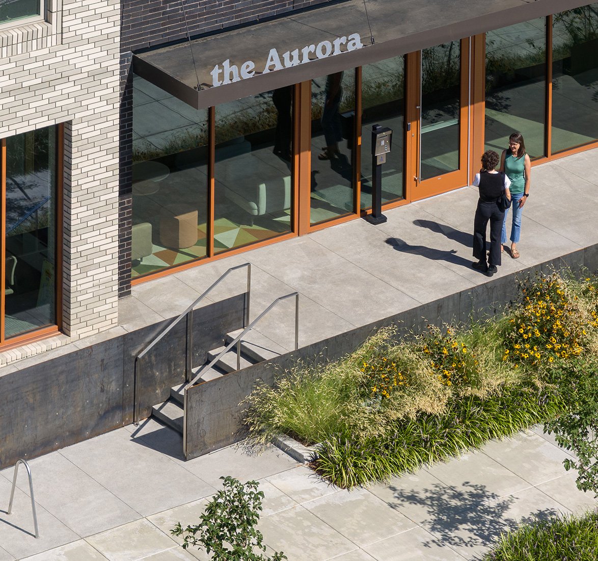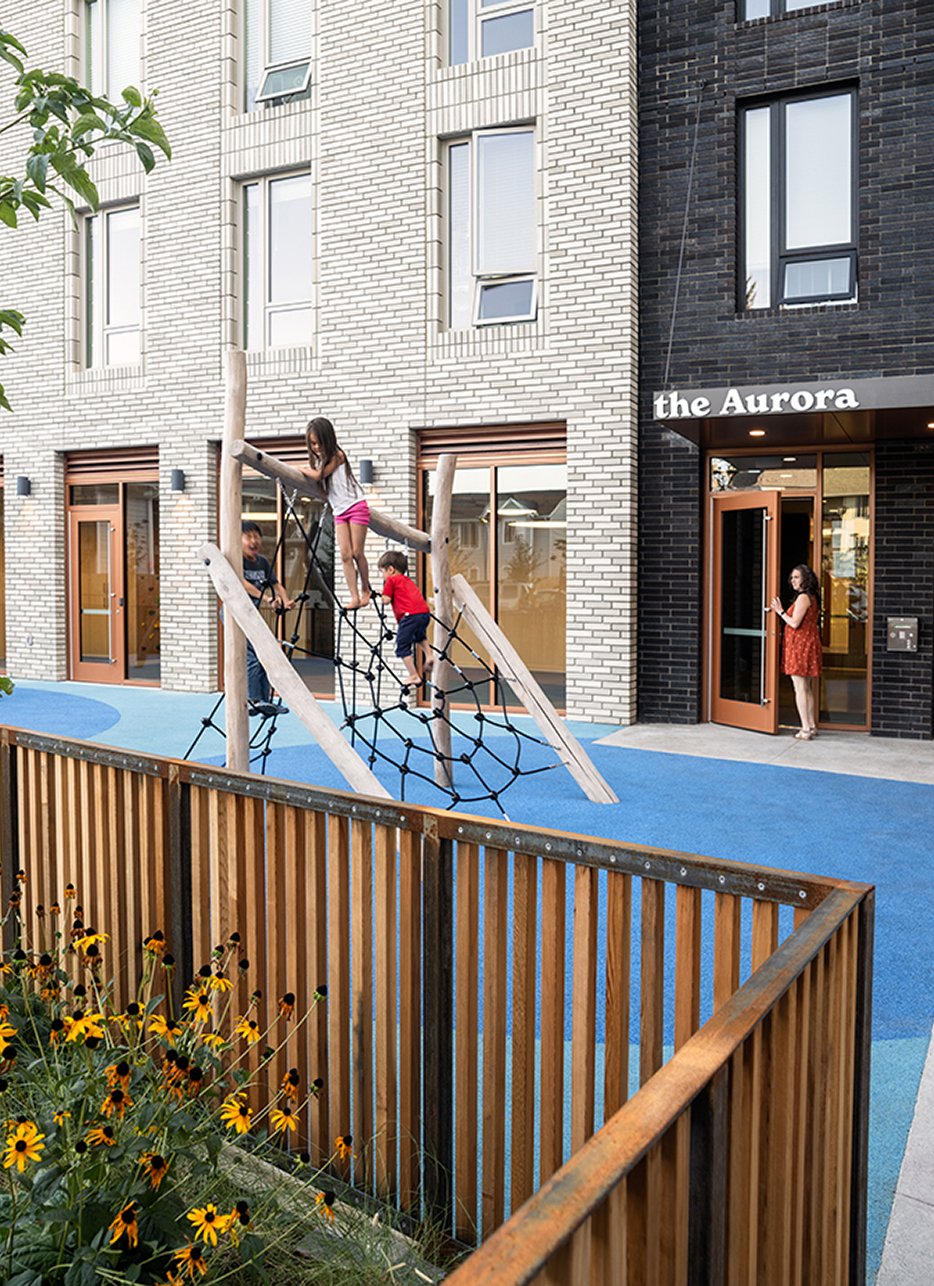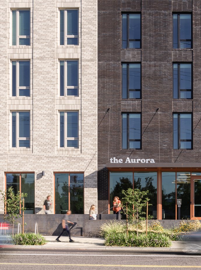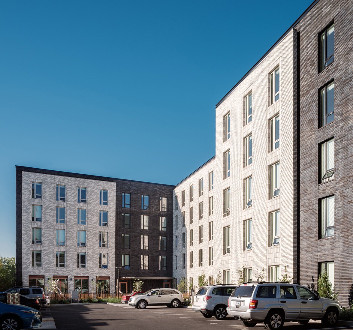 The Aurora is a 5-story, 94,000 SF development that provides 93 family-sized homes, including one- to three-bedroom units, with 16 designated as Permanent Supportive Housing (PSH). This project offers stable housing for individuals experiencing homelessness, along with comprehensive wraparound services to address housing instability, education and job training, and displacement challenges in the Rosewood neighborhood. The building’s L-shaped design incorporates several sustainable features, including a photovoltaic array for solar energy, energy-efficient appliances, and a durable, low-maintenance fully brick exterior. The combination of light and dark shades of brick, along with the arrangement and framing of windows in a vertical pattern, adds visual interest and depth to the façade. Conveniently within walking distance to a full-size grocery store and public transportation, the building includes a welcoming lobby with offices and resident amenities, such as a courtyard, community rooms, a demonstration kitchen, indoor and outdoor play areas, laundry room, bike storage, and parking, all designed to create a supportive atmosphere.