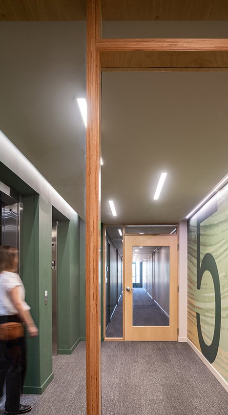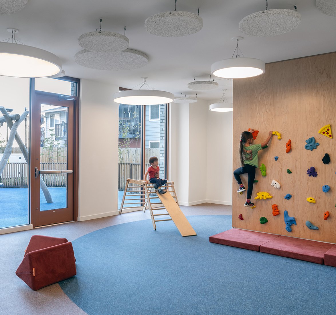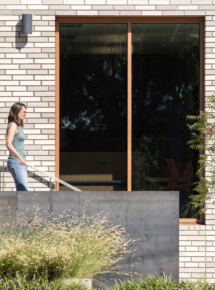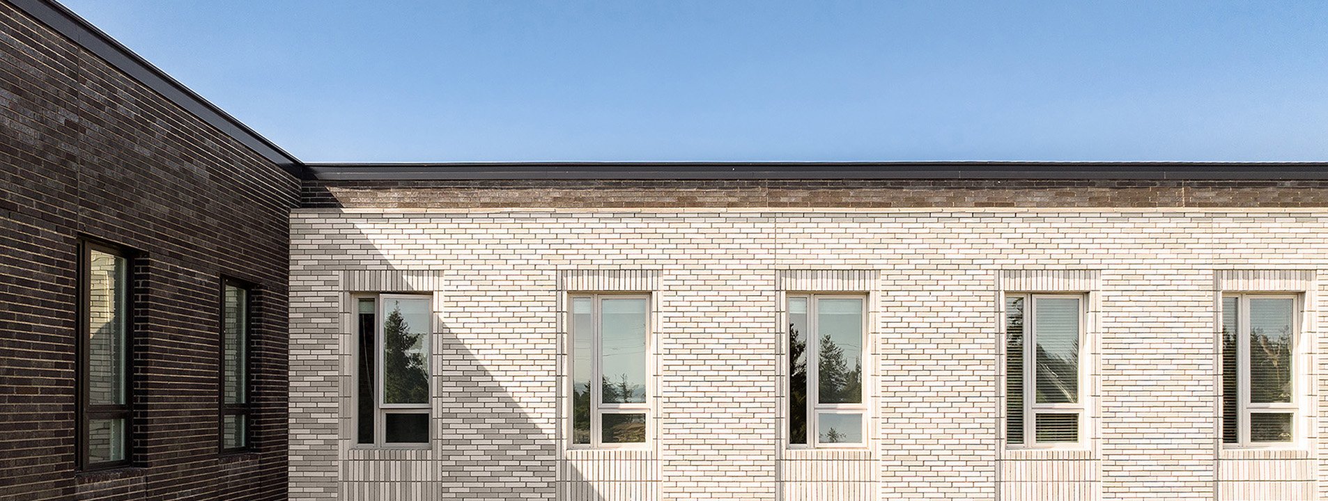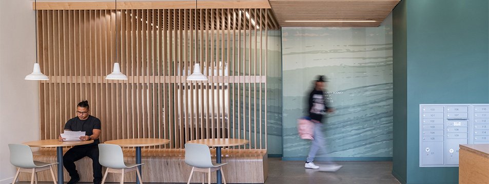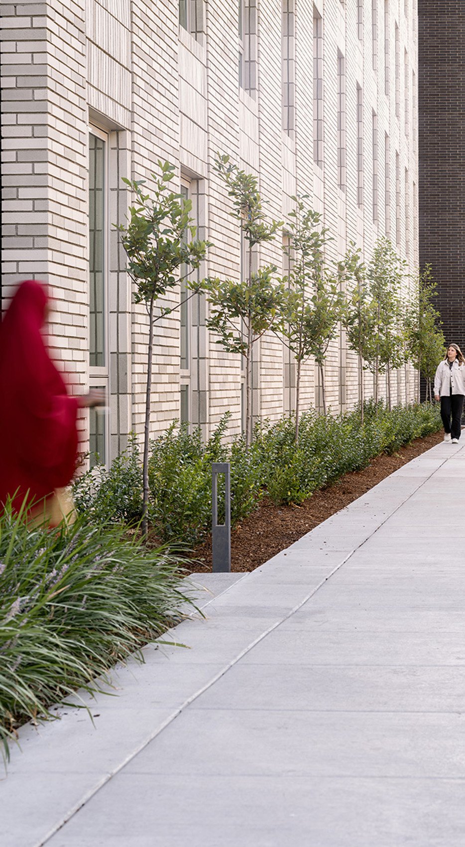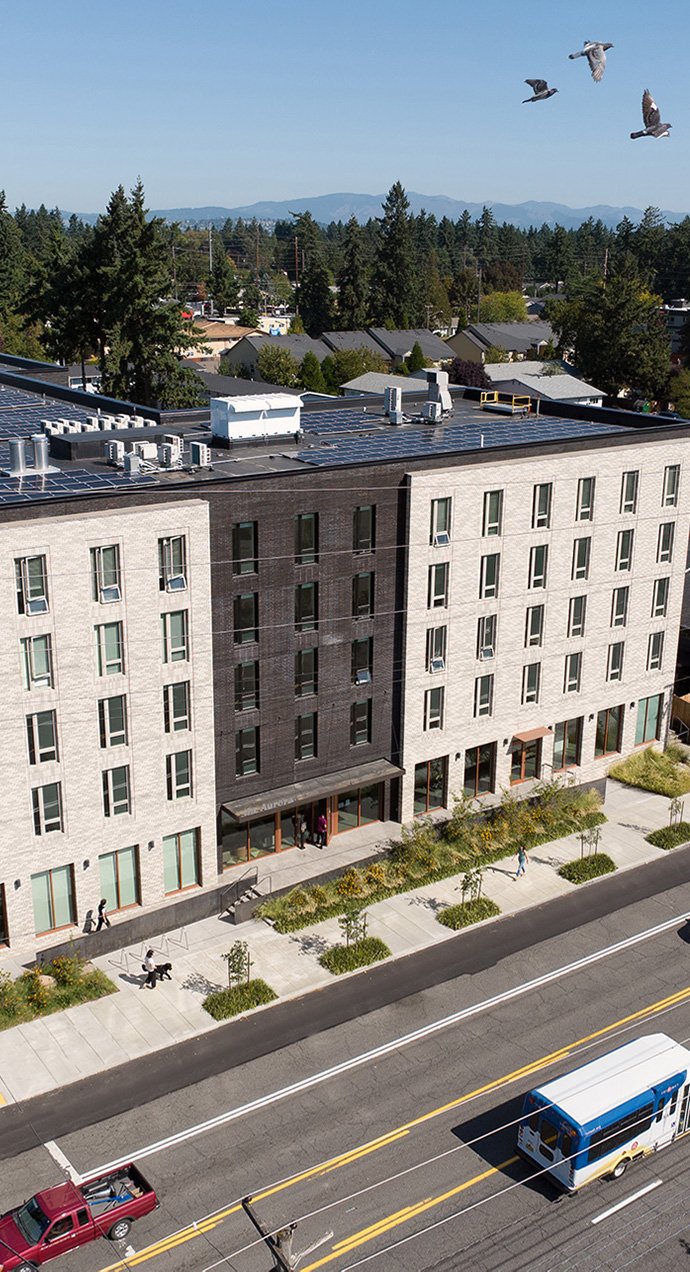 The Aurora is a 5-story, 94,000 SF development that provides 93 family-sized homes, including one- to three-bedroom units, with 16 designated as Permanent Supportive Housing (PSH). This project offers stable housing for individuals experiencing homelessness, along with comprehensive wraparound services to address housing instability, education and job training, and displacement challenges in the Rosewood neighborhood. The building’s L-shaped design incorporates several sustainable features, including a photovoltaic array for solar energy, energy-efficient appliances, and a durable, low-maintenance fully brick exterior. The combination of light and dark shades of brick, along with the arrangement and framing of windows in a vertical pattern, adds visual interest and depth to the façade. Conveniently within walking distance to a full-size grocery store and public transportation, the building includes a welcoming lobby with offices and resident amenities, such as a courtyard, community rooms, a demonstration kitchen, indoor and outdoor play areas, laundry room, bike storage, and parking, all designed to create a supportive atmosphere.