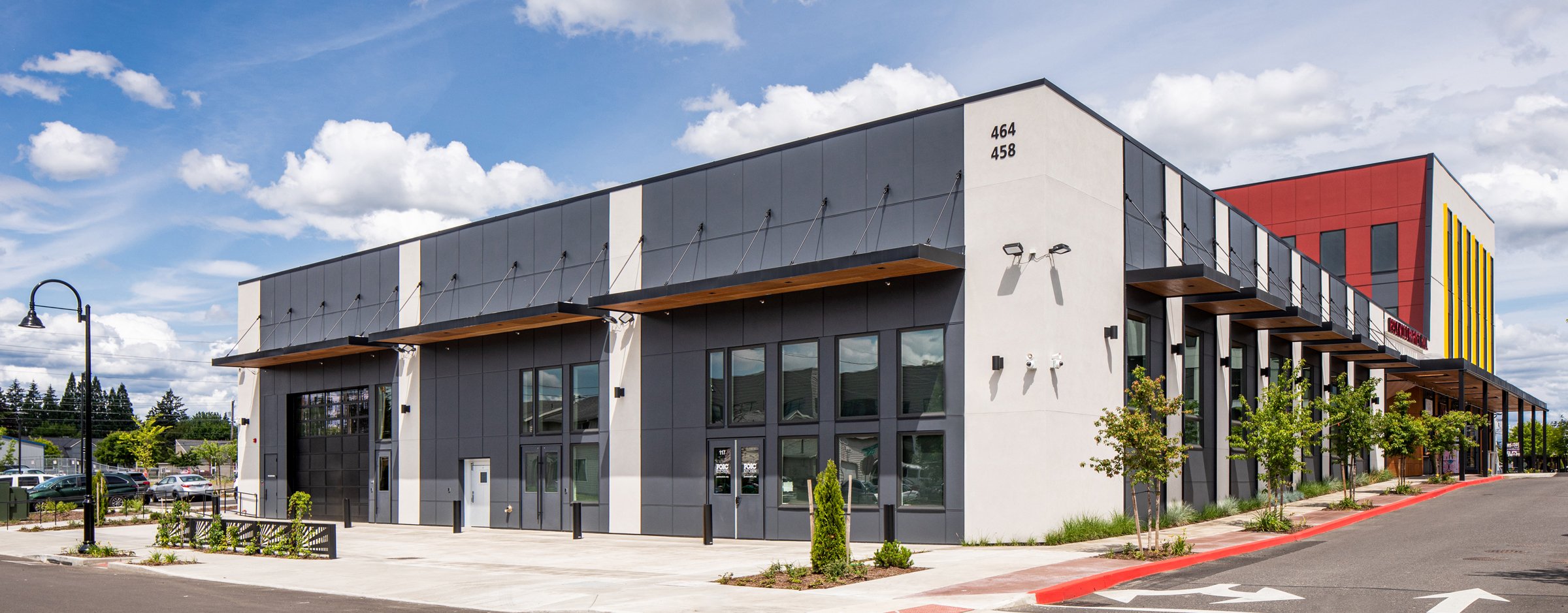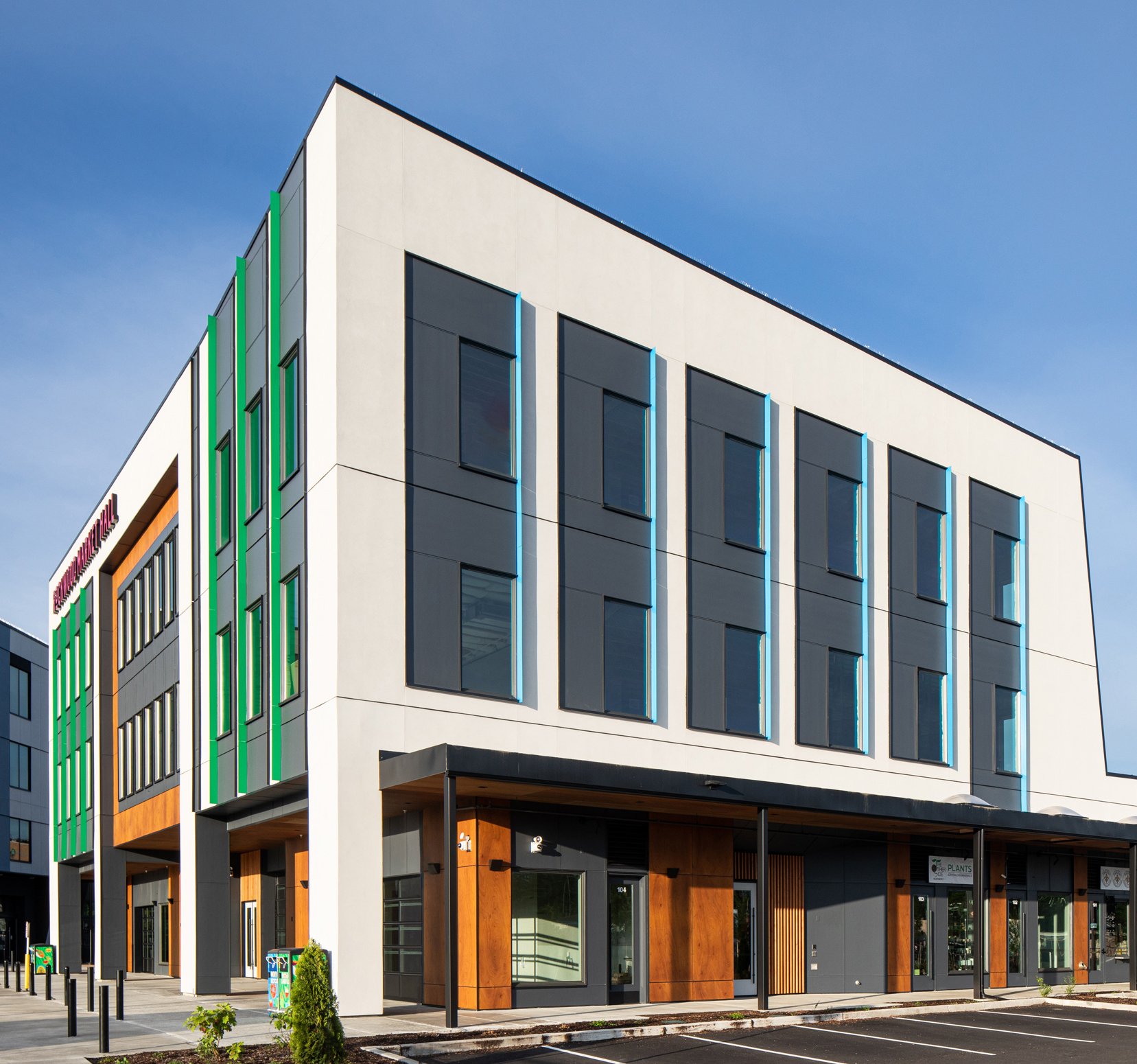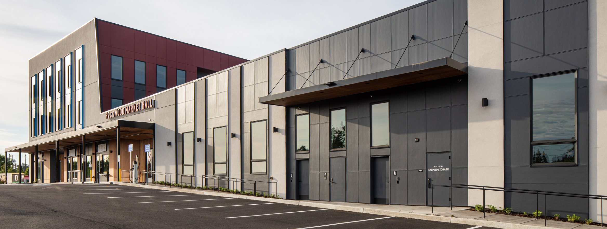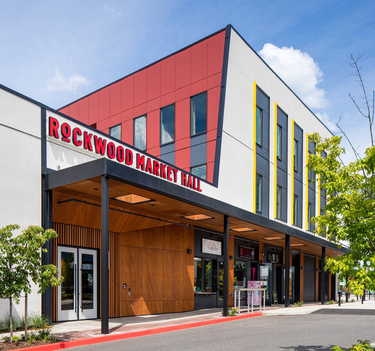 Eighteen garage doors were installed, with the majority enclosing many micro-businesses, along with the exterior of the building made of Prodema cladding, painted fiber cement, and stucco. Bold, warm tones of red and natural wood compliment the modern structure, along with vibrant splashes of yellow, green, and blue accents. Like the open market hall, the office spaces were built as a shell to allow future tenants to have creative agency for the finished design. Eight-foot-tall windows throughout the 2nd and 3rd levels invite ample natural light to fill the building while boasting east views of Mt. Hood and stunning sunsets to the west; the Rockwood Market Hall is one that we are excited to encourage all to experience.