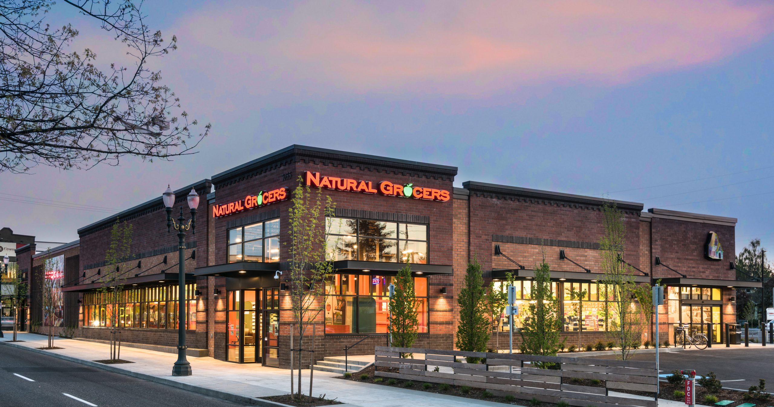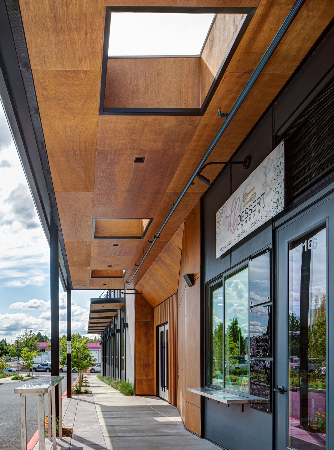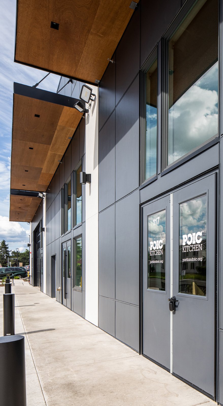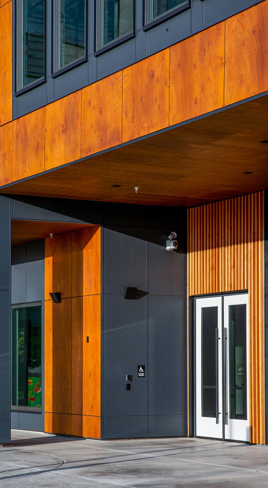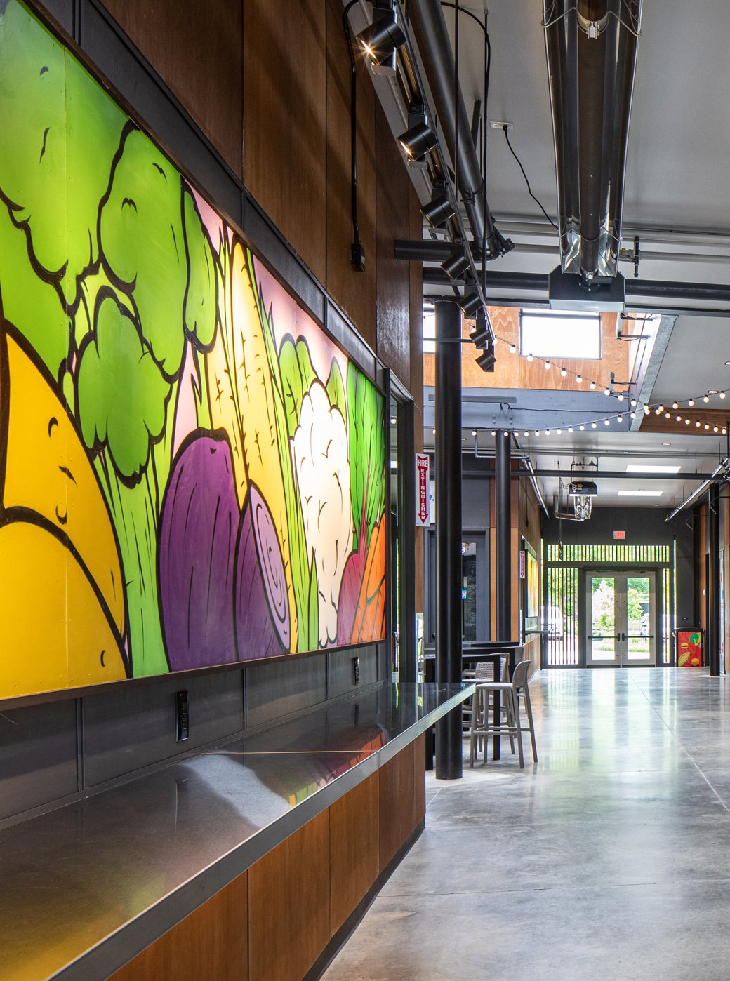 Eighteen garage doors were installed, with the majority enclosing many micro-businesses, along with the exterior of the building made of Prodema cladding, painted fiber cement, and stucco. Bold, warm tones of red and natural wood compliment the modern structure, along with vibrant splashes of yellow, green, and blue accents. Like the open market hall, the office spaces were built as a shell to allow future tenants to have creative agency for the finished design. Eight-foot-tall windows throughout the 2nd and 3rd levels invite ample natural light to fill the building while boasting east views of Mt. Hood and stunning sunsets to the west; the Rockwood Market Hall is one that we are excited to encourage all to experience.
