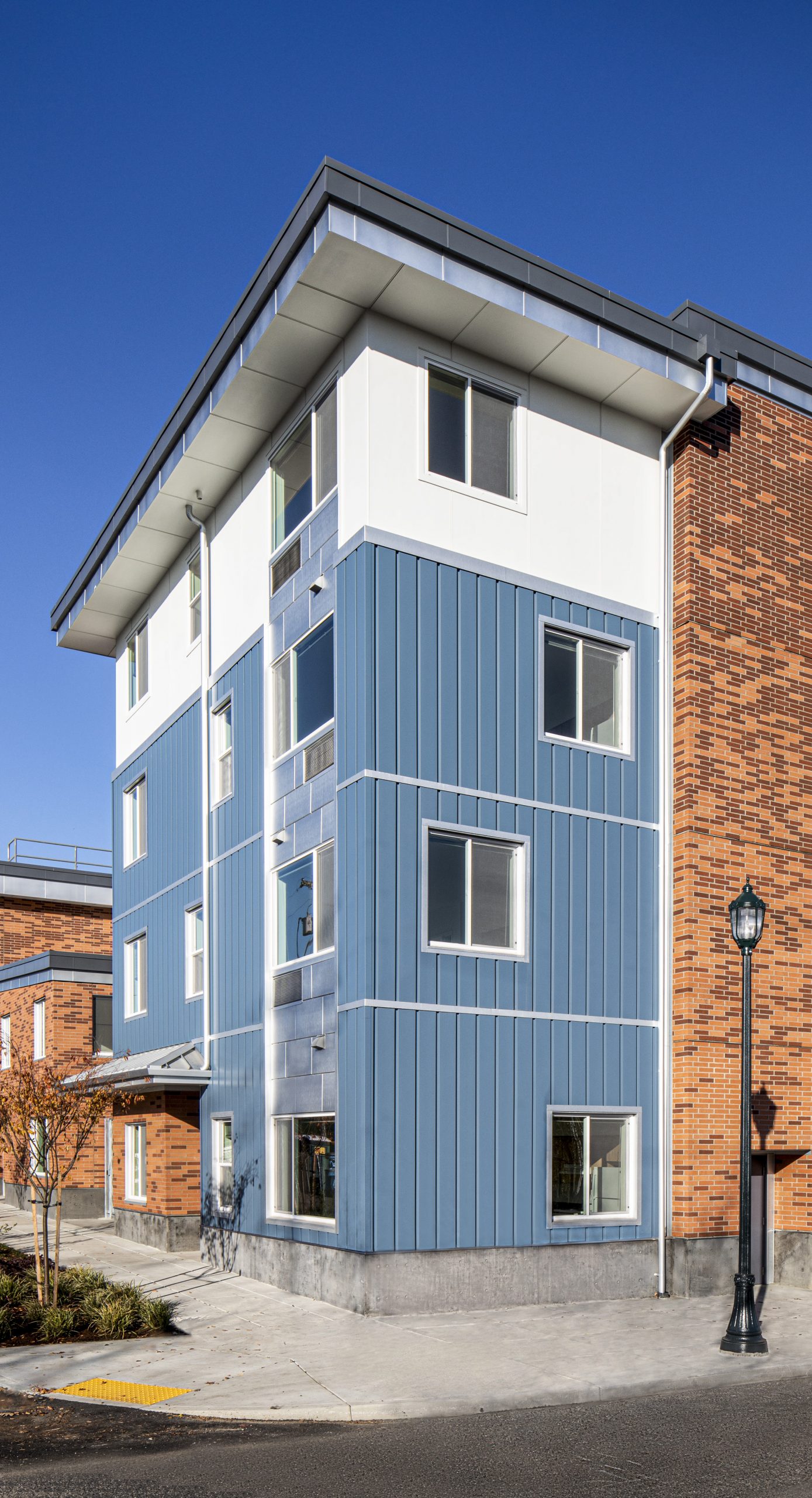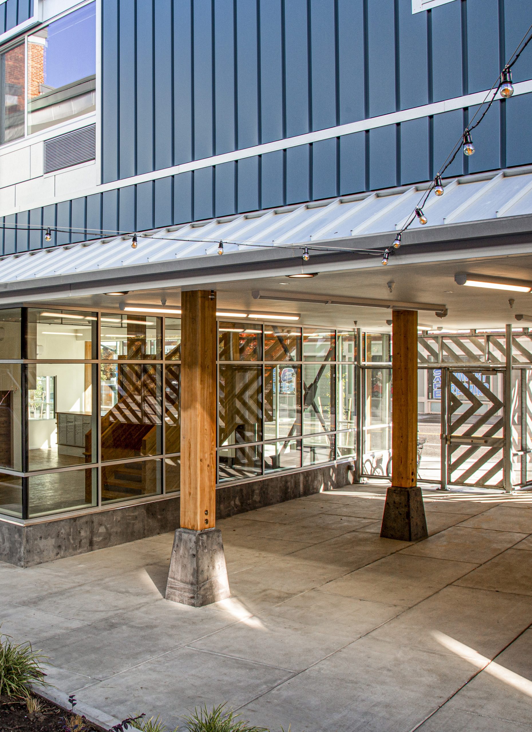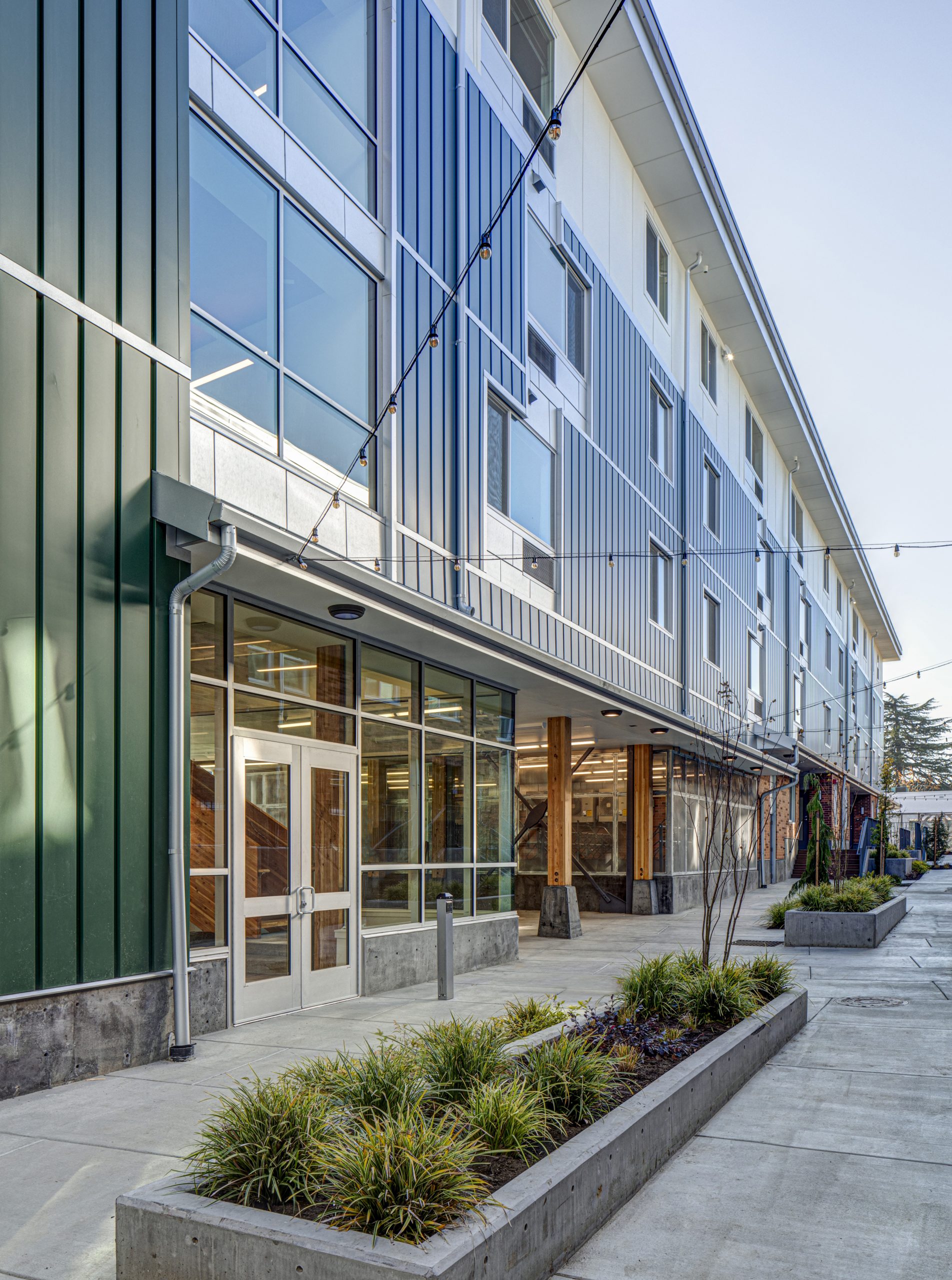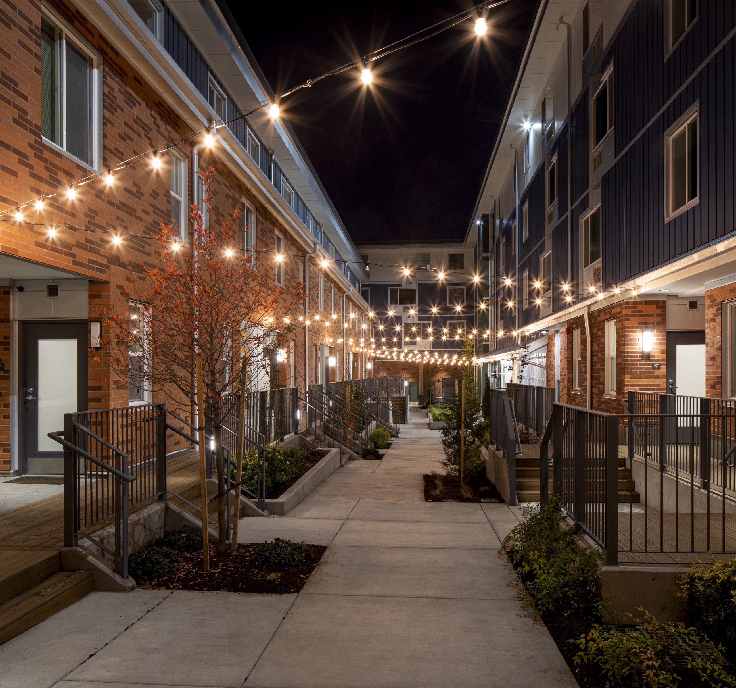 King + Parks is a four-story and 83,000 SF apartment building with 70 multifamily homes, including 12 two-story townhomes, located in the historic Piedmont neighborhood. Led by PCRI and the community-centered vision of the North/Northeast Neighborhood Housing Strategy, King + Parks provides affordable housing with preference to North and Northeast Portland residents, many of whom were negatively impacted or displaced by inattentive efforts to revitalize the area over several decades. The courtyard is the central focus of this U-shaped structure with rows of townhome-style units complementing the community spaces with gardens, sitting areas, bike storage and repair stations, energy-efficient features, and sustainable design; bioswale drainage systems, Low E for solar heat transfer, and energy-efficient design.