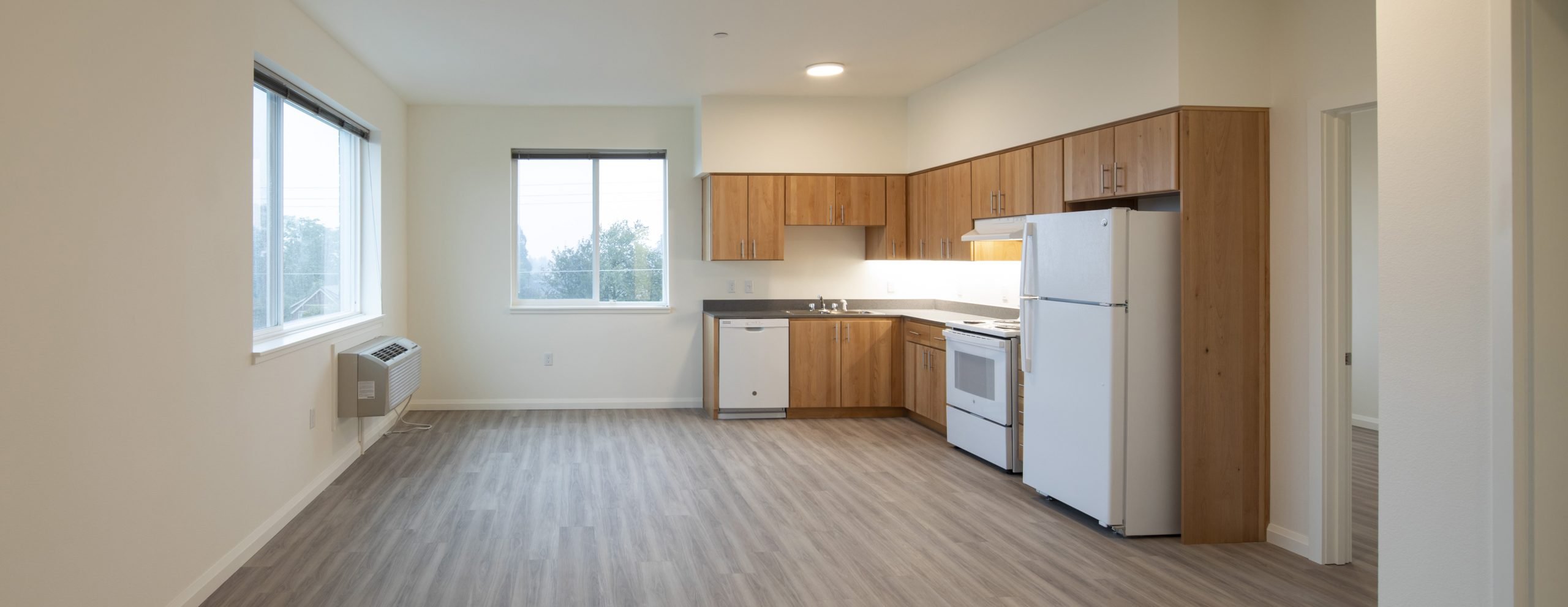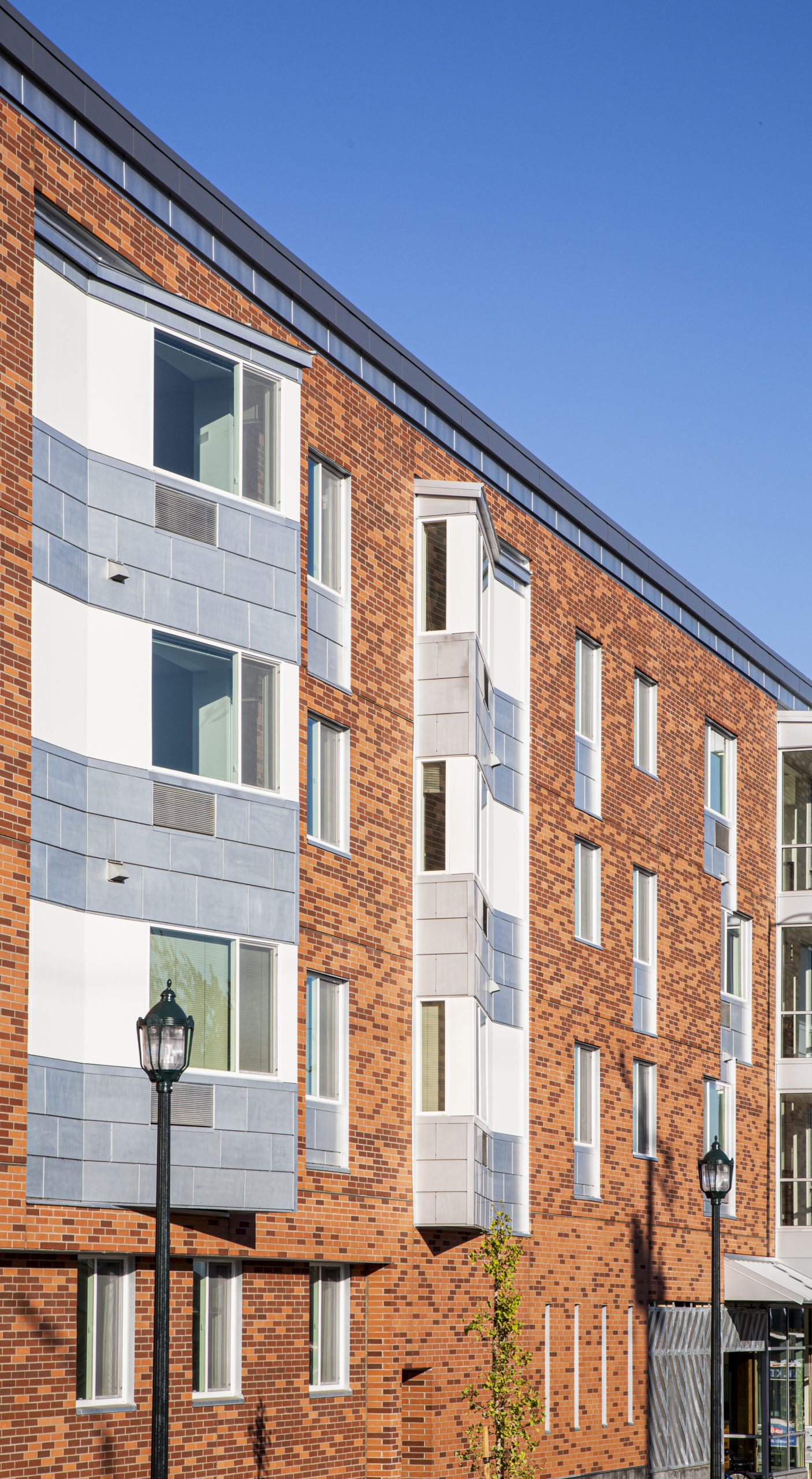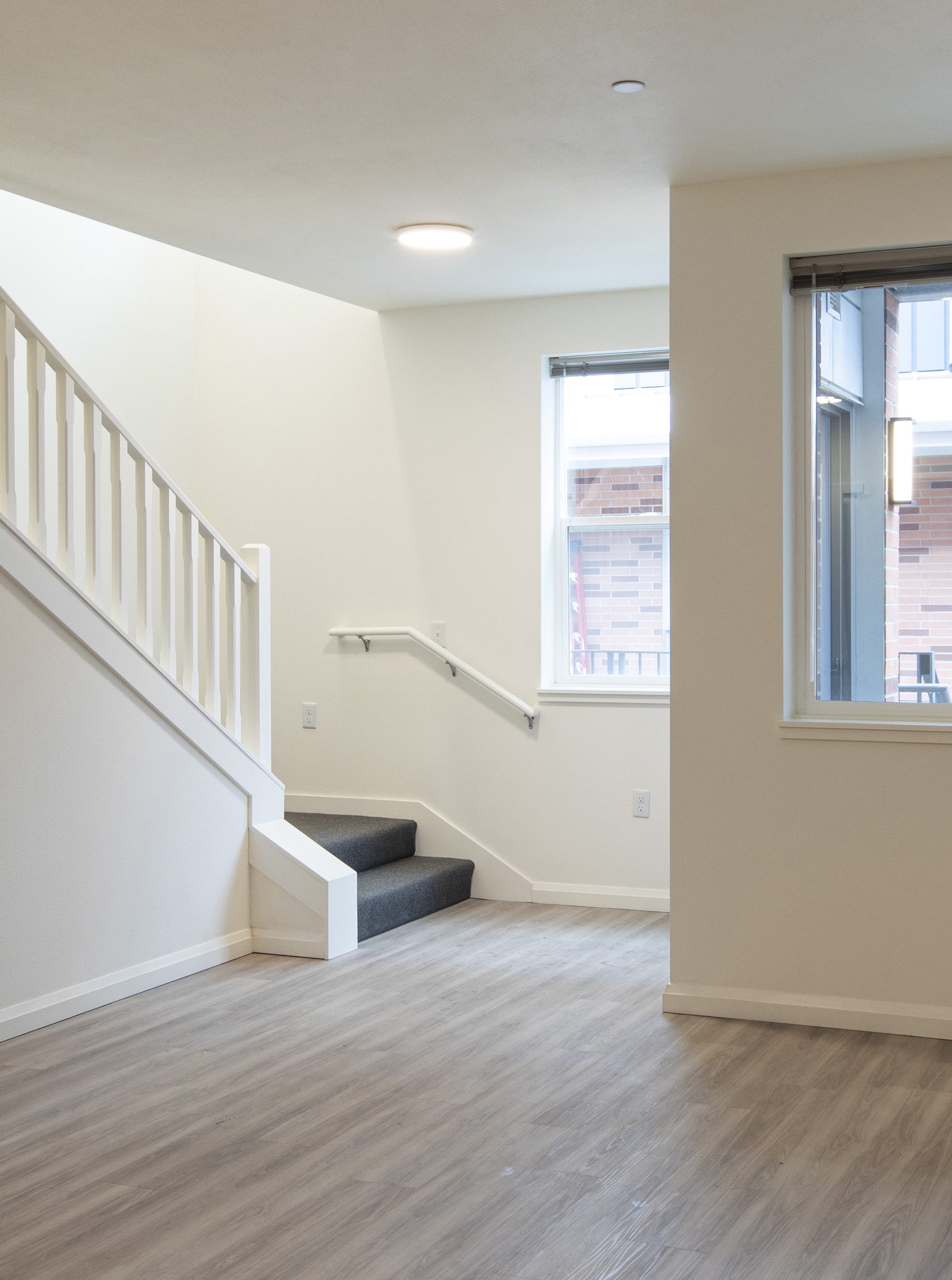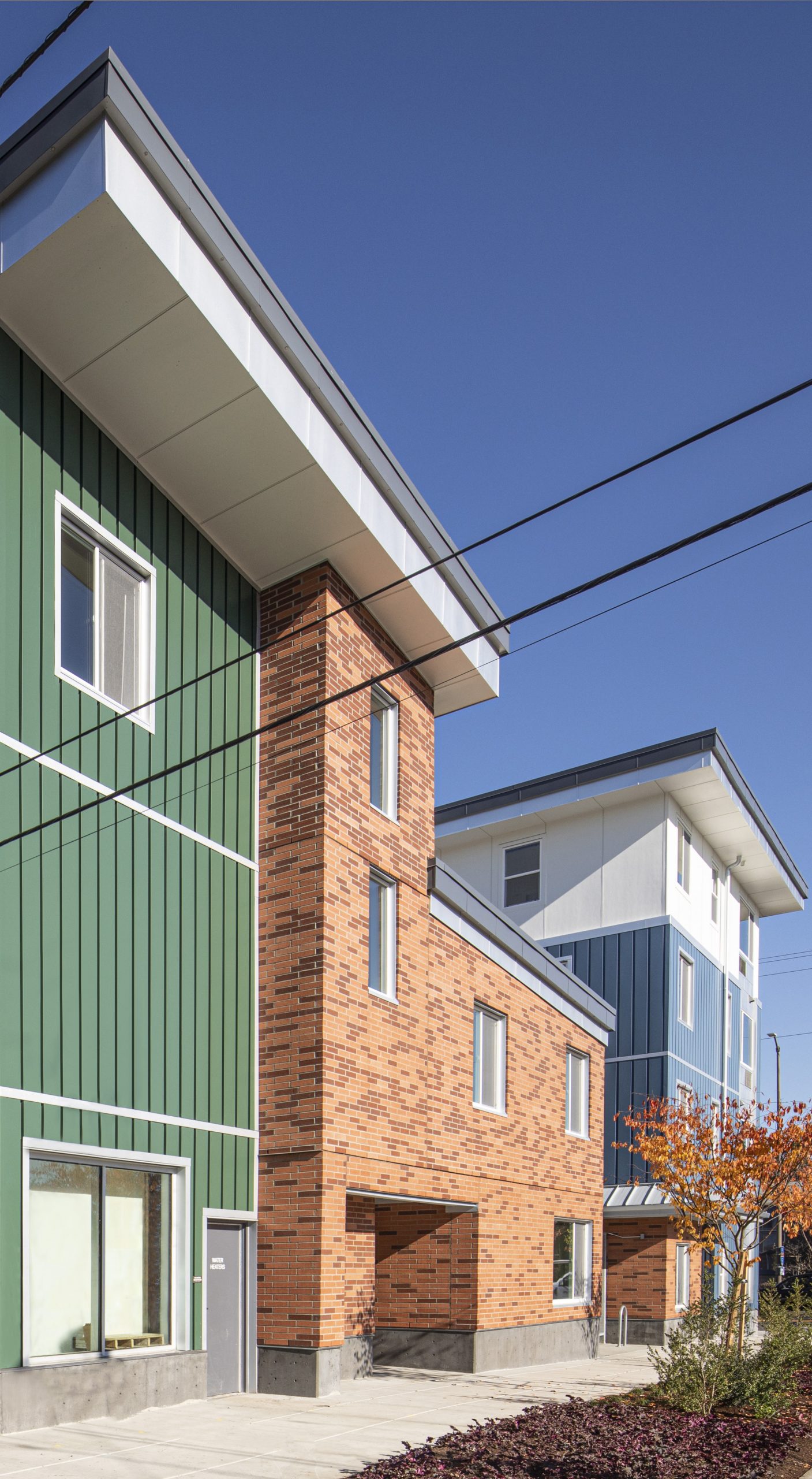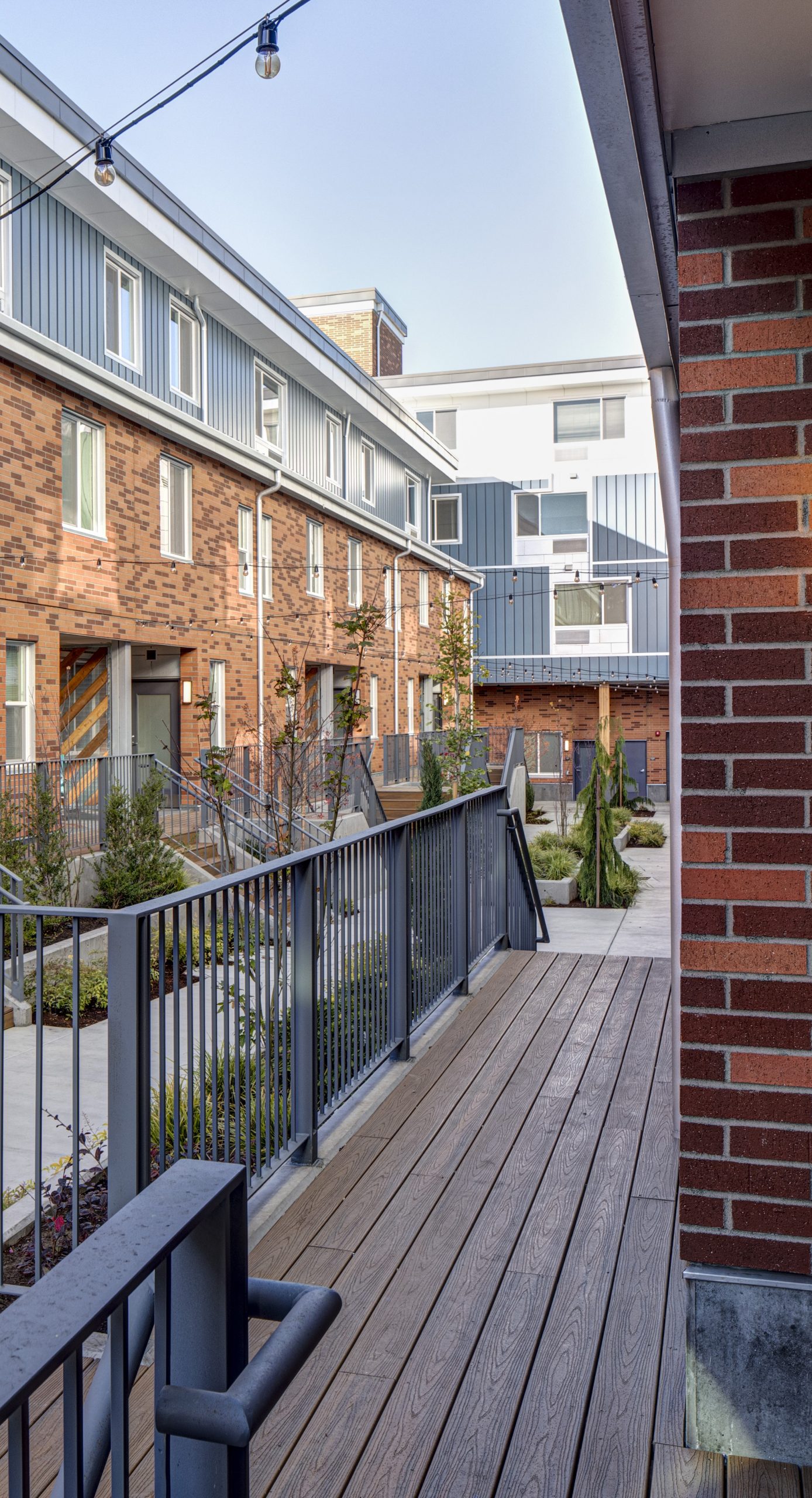King + Parks is a four-story and 83,000 SF apartment building with 70 multifamily homes, including 12 two-story townhomes, located in the historic Piedmont neighborhood. Led by PCRI and the community-centered vision of the North/Northeast Neighborhood Housing Strategy, King + Parks provides affordable housing with preference to North and Northeast Portland residents, many of whom were negatively impacted or displaced by inattentive efforts to revitalize the area over several decades. The courtyard is the central focus of this U-shaped structure with rows of townhome-style units complementing the community spaces with gardens, sitting areas, bike storage and repair stations, energy-efficient features, and sustainable design; bioswale drainage systems, Low E for solar heat transfer, and energy-efficient design.